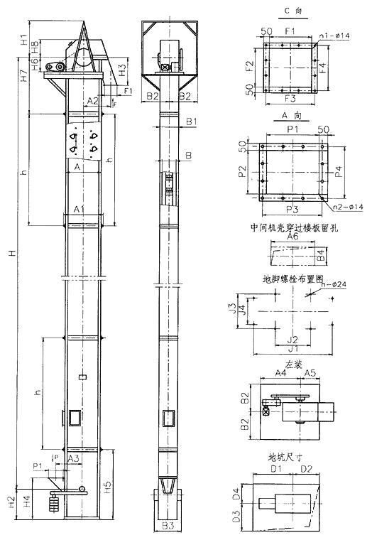 NE系列板鏈式斗式提升機由運行部件、驅動裝置、上部裝置、中部機殼、下部裝置組成。