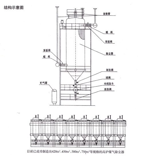高爐煤氣干法脈沖袋式除塵器由荒煤氣主管來的荒煤氣(260度)經(jīng)支管進(jìn)入,袋式除塵器的下部箱休,進(jìn)行機(jī)械分離之后,煤氣向上經(jīng)布袋過濾,微細(xì)粉塵附著在濾袋外表面,凈煤氣通過濾袋匯集到上箱體,經(jīng)凈煤氣支管,主管時入熱風(fēng)爐等使用。
